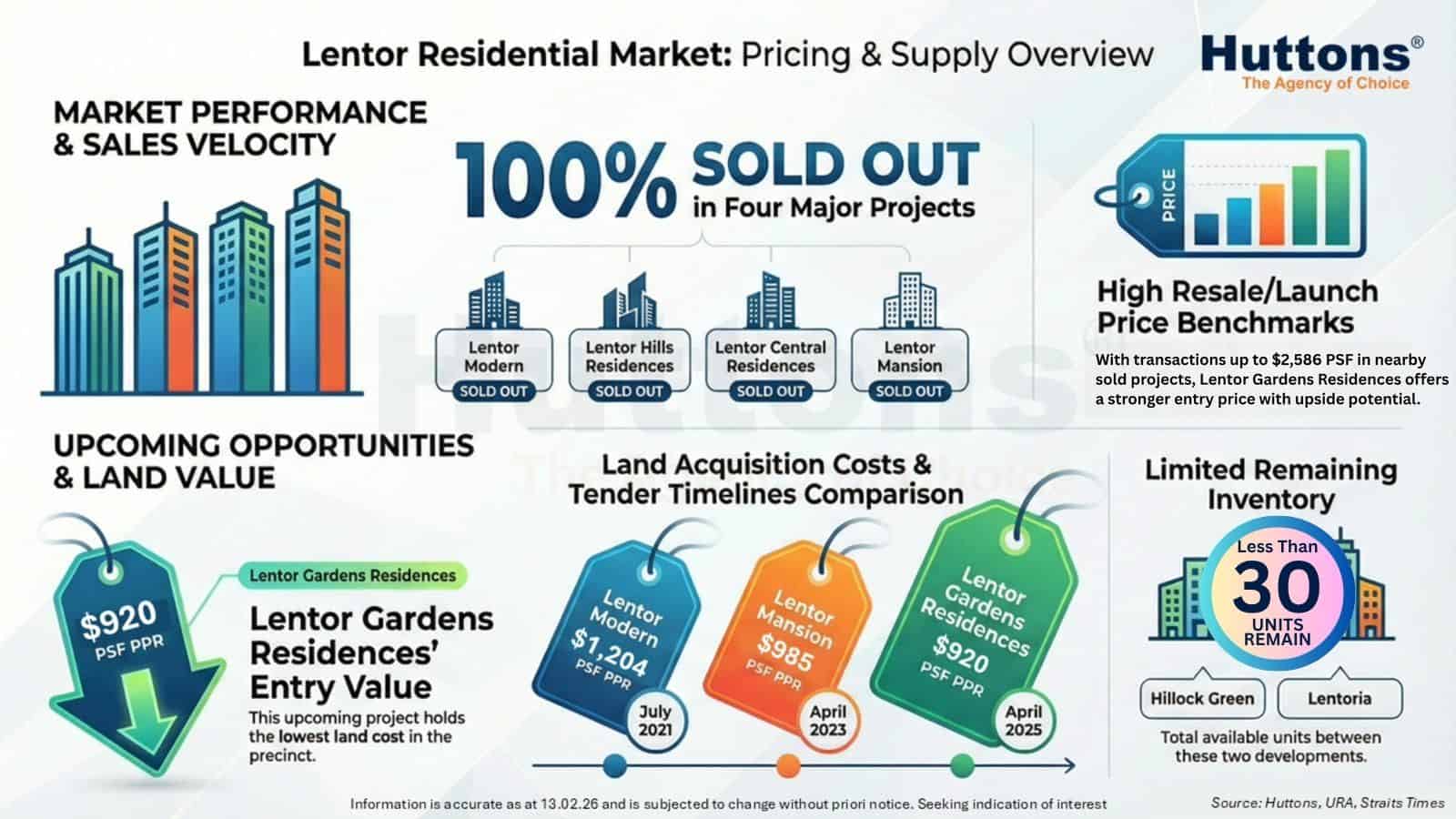The precinct’s upside is powered by three structural tailwinds. First, MRT-led connectivity: the Thomson–East Coast Line (TEL5) Lentor station dramatically reduces travel times to Orchard, the CBD, and Marina Bay, unlocking rental demand from professionals who previously overlooked this corridor. Second, the phased release of new GLS sites — including the Lentor Central parcel awarded in March 2026 at a record $1,278 psf ppr — effectively resets land price benchmarks upward, providing a rising tide for earlier-vintage sites like Lentor Gardens Residences. Third, the project’s position at the boundary of the GHS Lentor Growth Hotspot means it is directly in the path of government-backed infrastructure upgrades and rezoning benefits — a positioning that has historically driven outperformance of 10–15% over a 10-year horizon relative to non-hotspot sites.